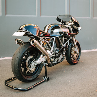 Starting life as a 2002 Ducati Supersport this machine is now transformed into a cool retro classic. Essentially it is a Muzano 900S but the customer want a different seat look so we designed and built one to his taste. This required the frame to be shortened & a rear hoop welded on. All the bodywork, paint and most of the fabrication was completed by Muzzabikes and the final assembly & wiring done at Mecanica. Customer is very happy!